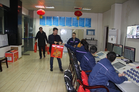他們先后來(lái)到生產(chǎn)調(diào)度室、合成總控室、尿素總控室、合成巡檢室、泵房巡檢室、110KVA變電站值班室、壓縮機(jī)值班室、循環(huán)水值班室、液氨球罐值班室等崗位,向堅(jiān)守在工作崗位的員工送去禮品和春節(jié)祝福。
